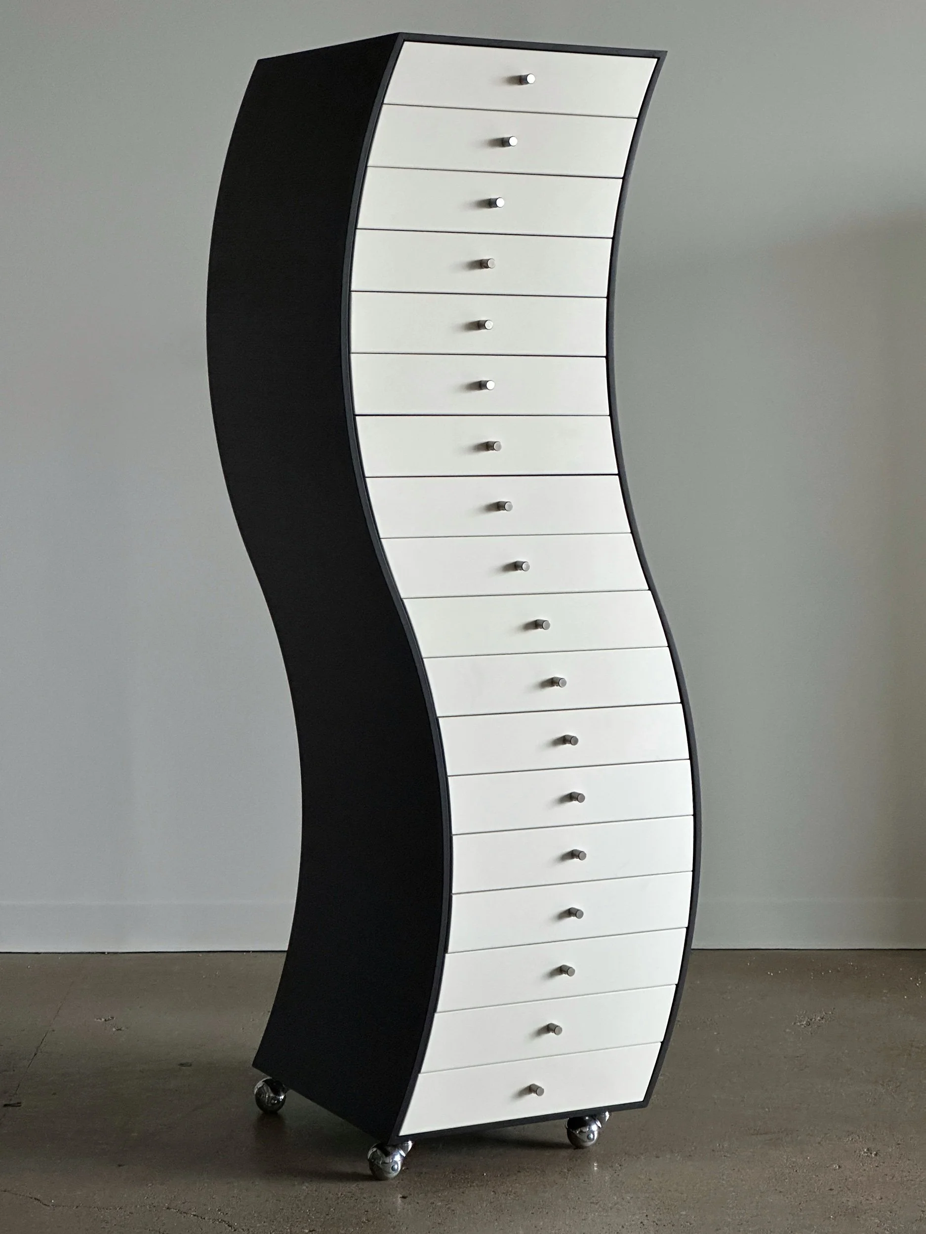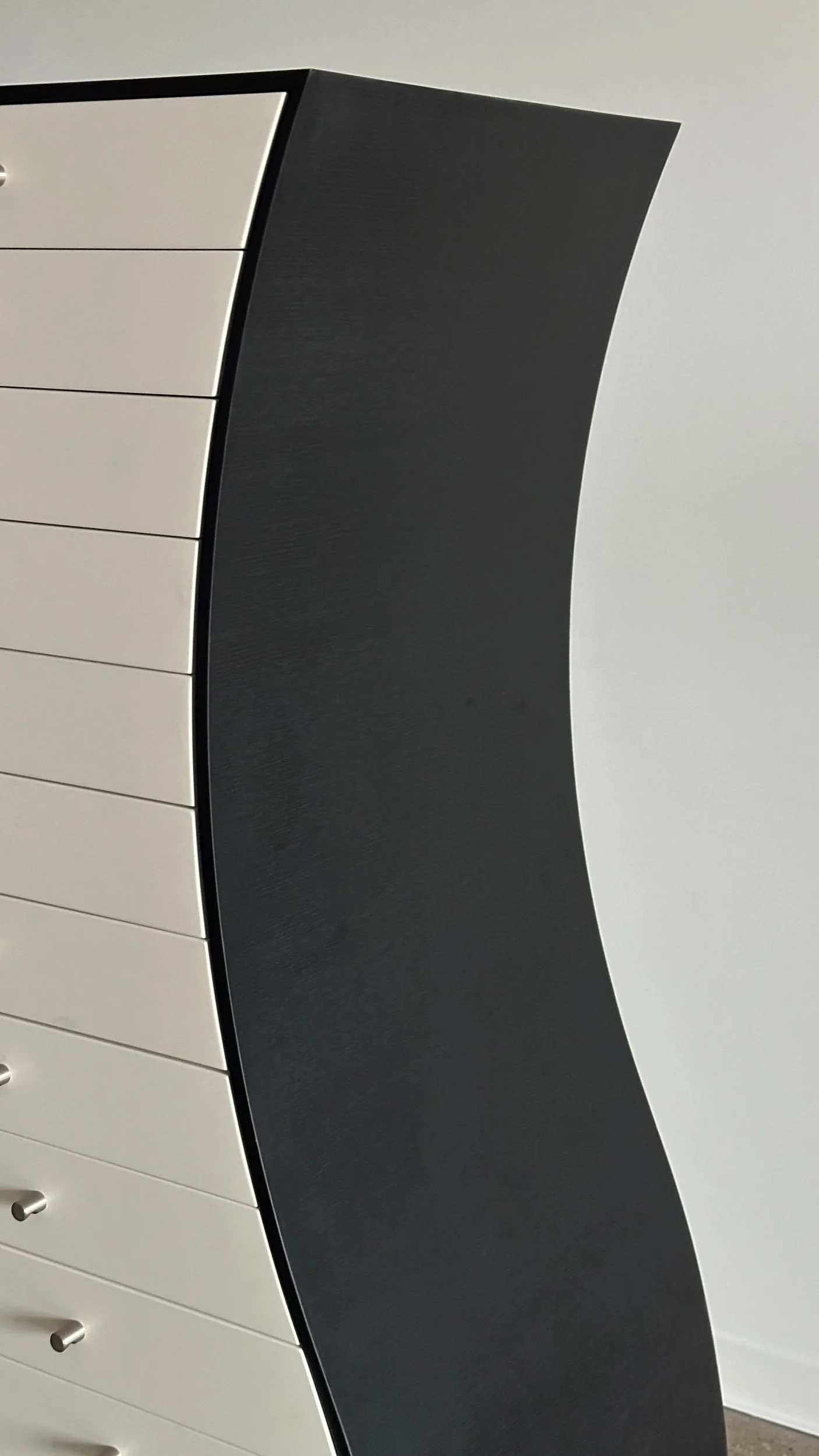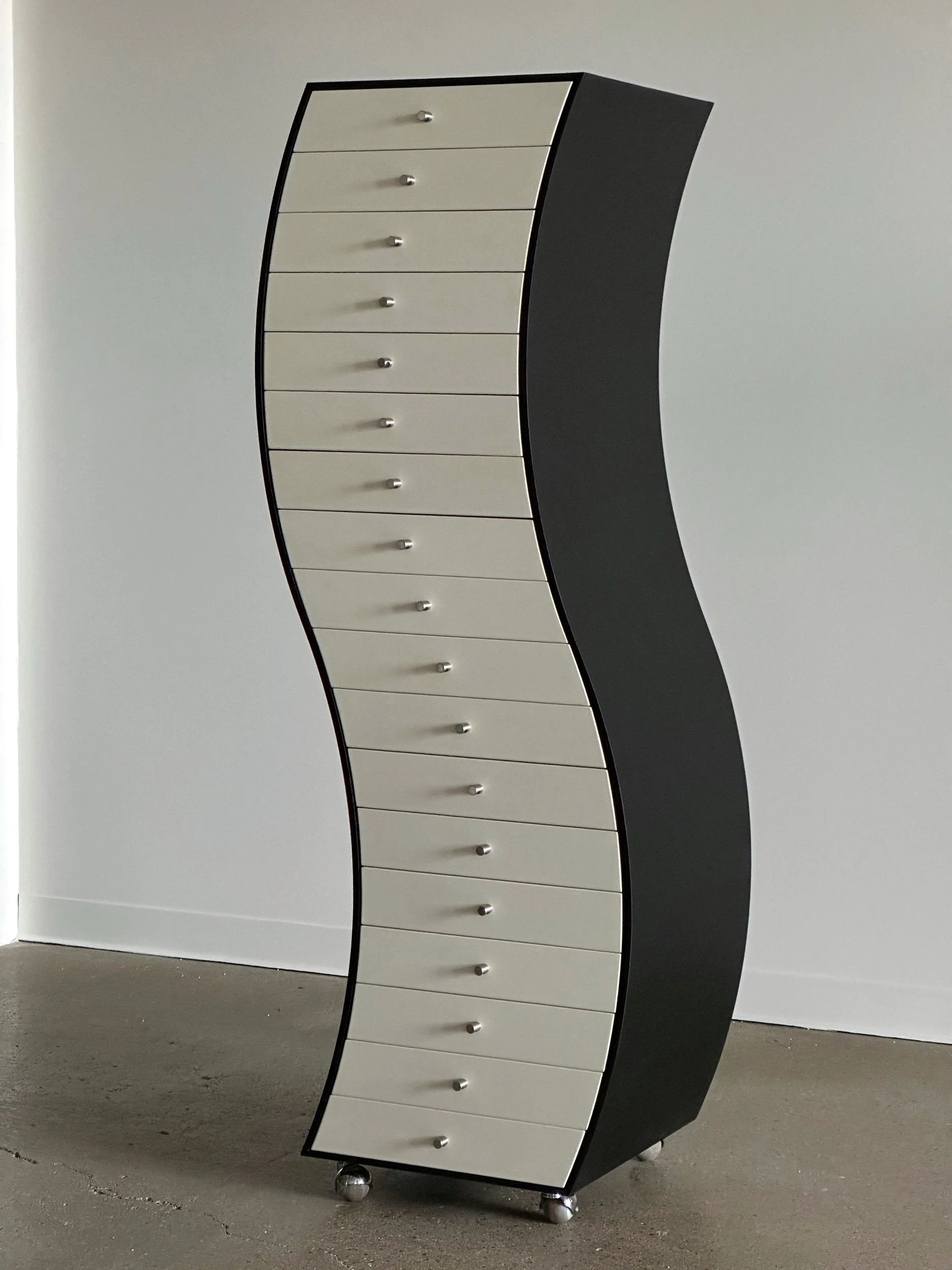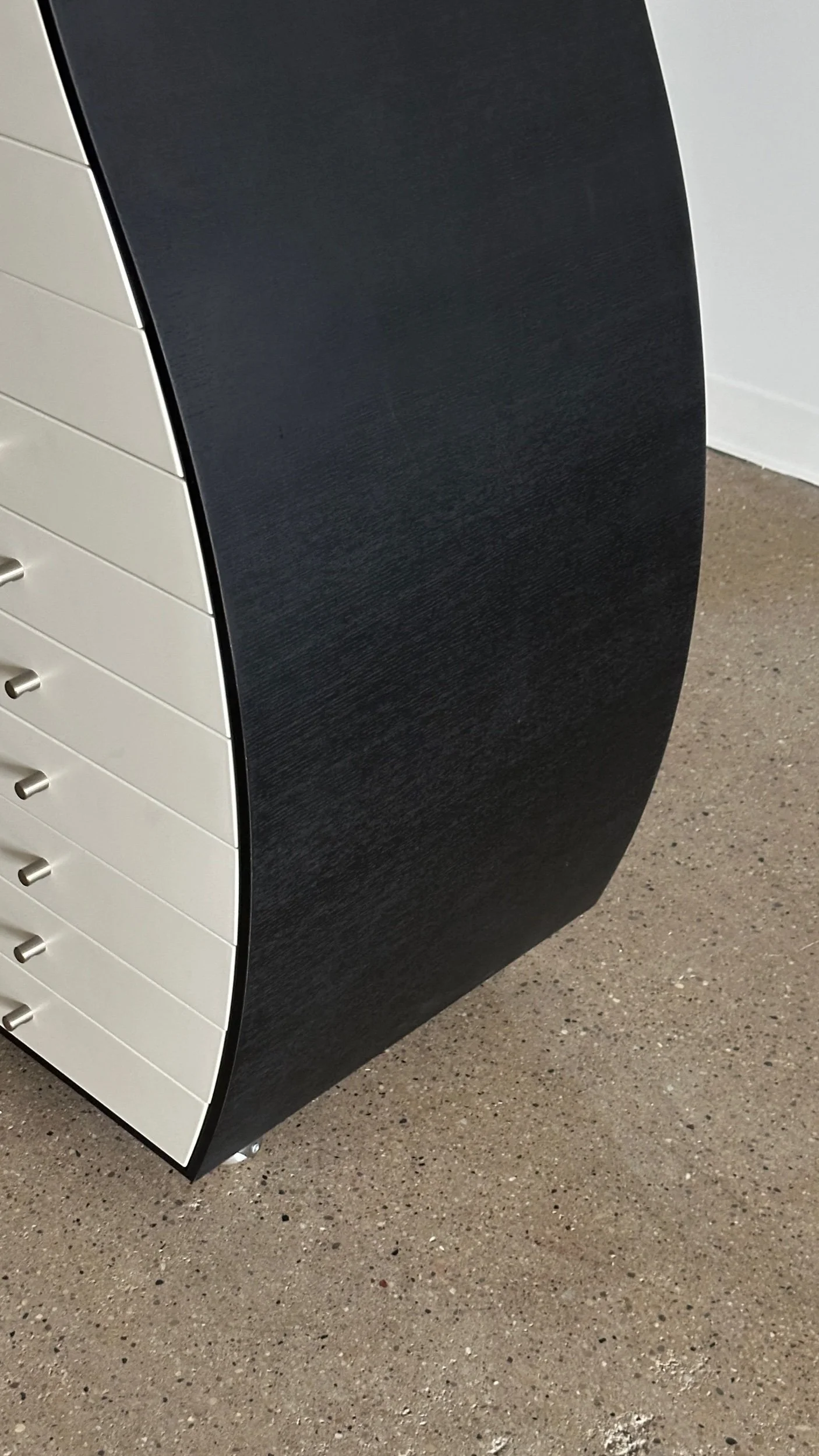 Italy, designed 1970, this example produced in 1992. Black stained ash with white matte lacquered drawer fronts and brushed steel pulls.
