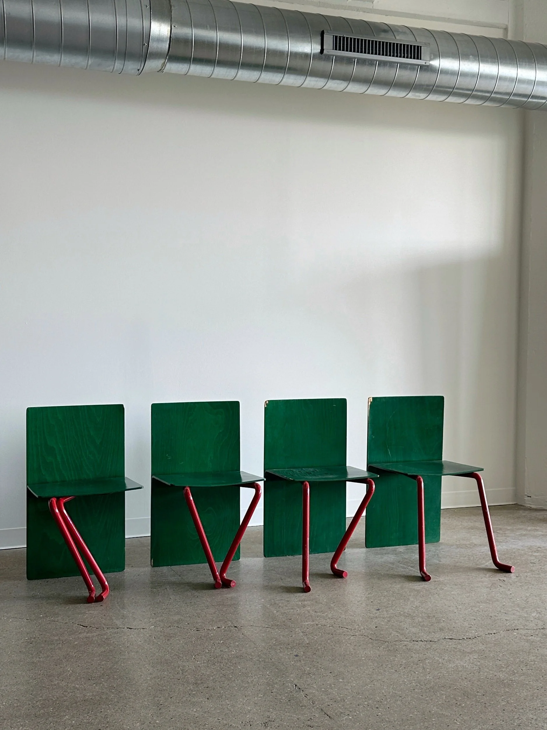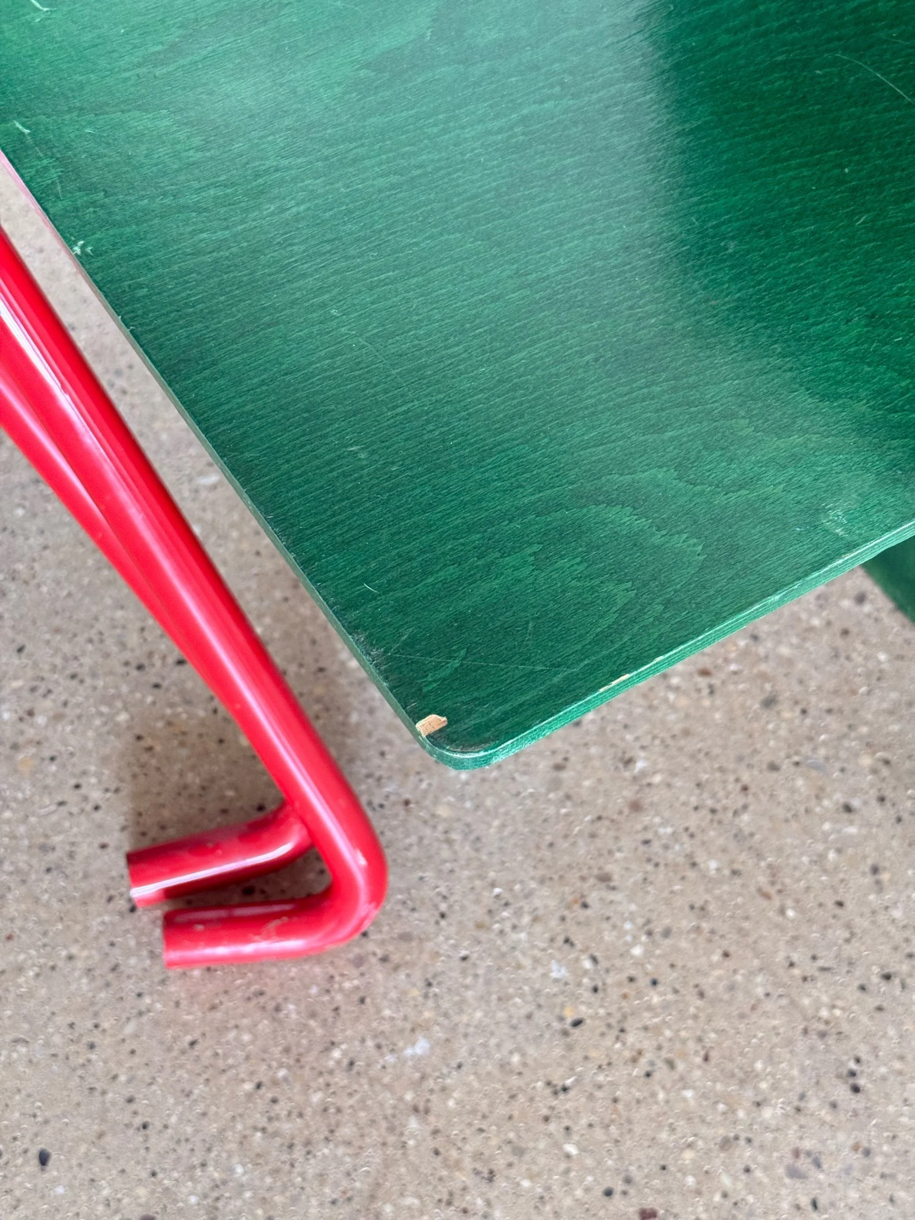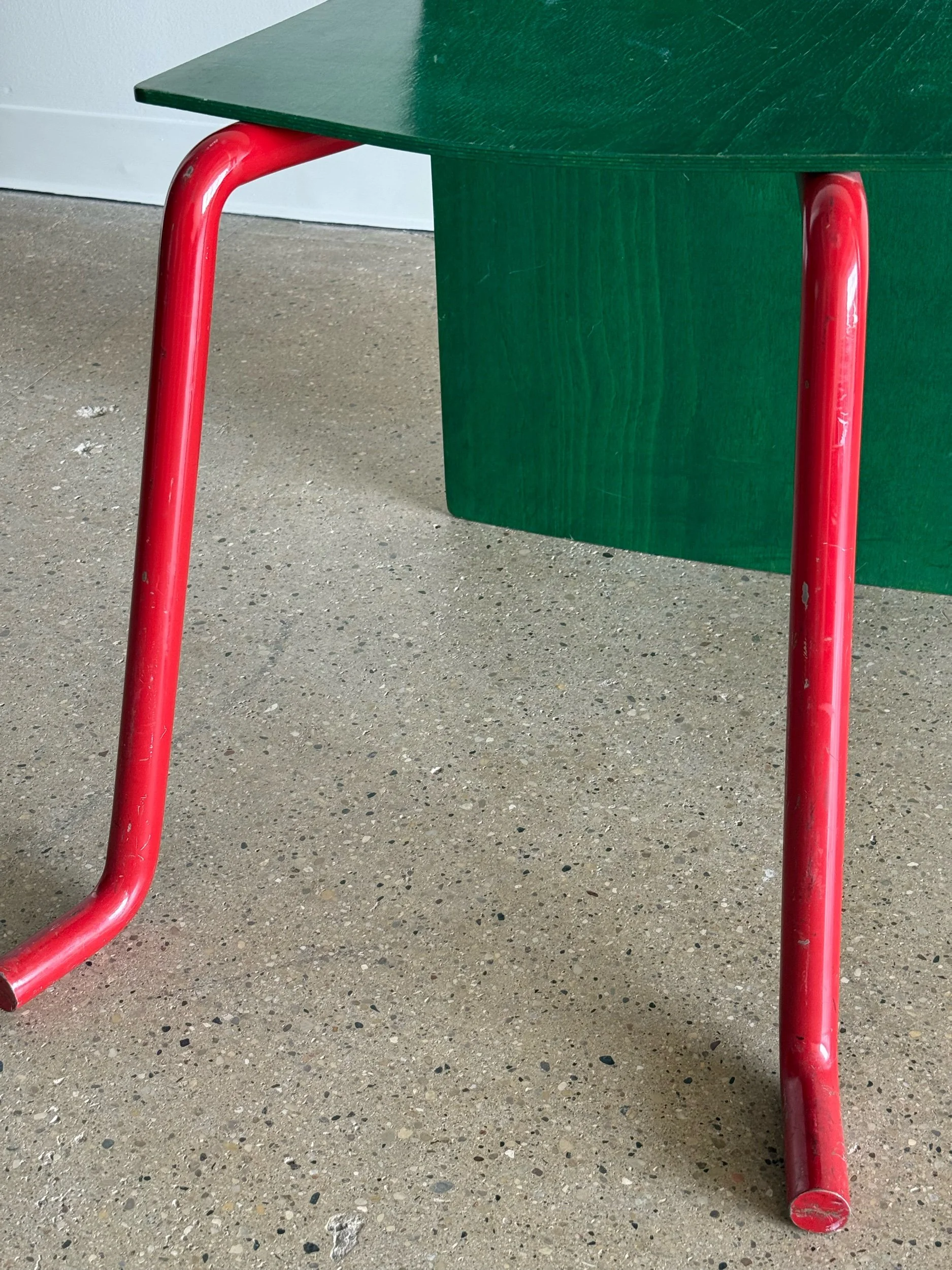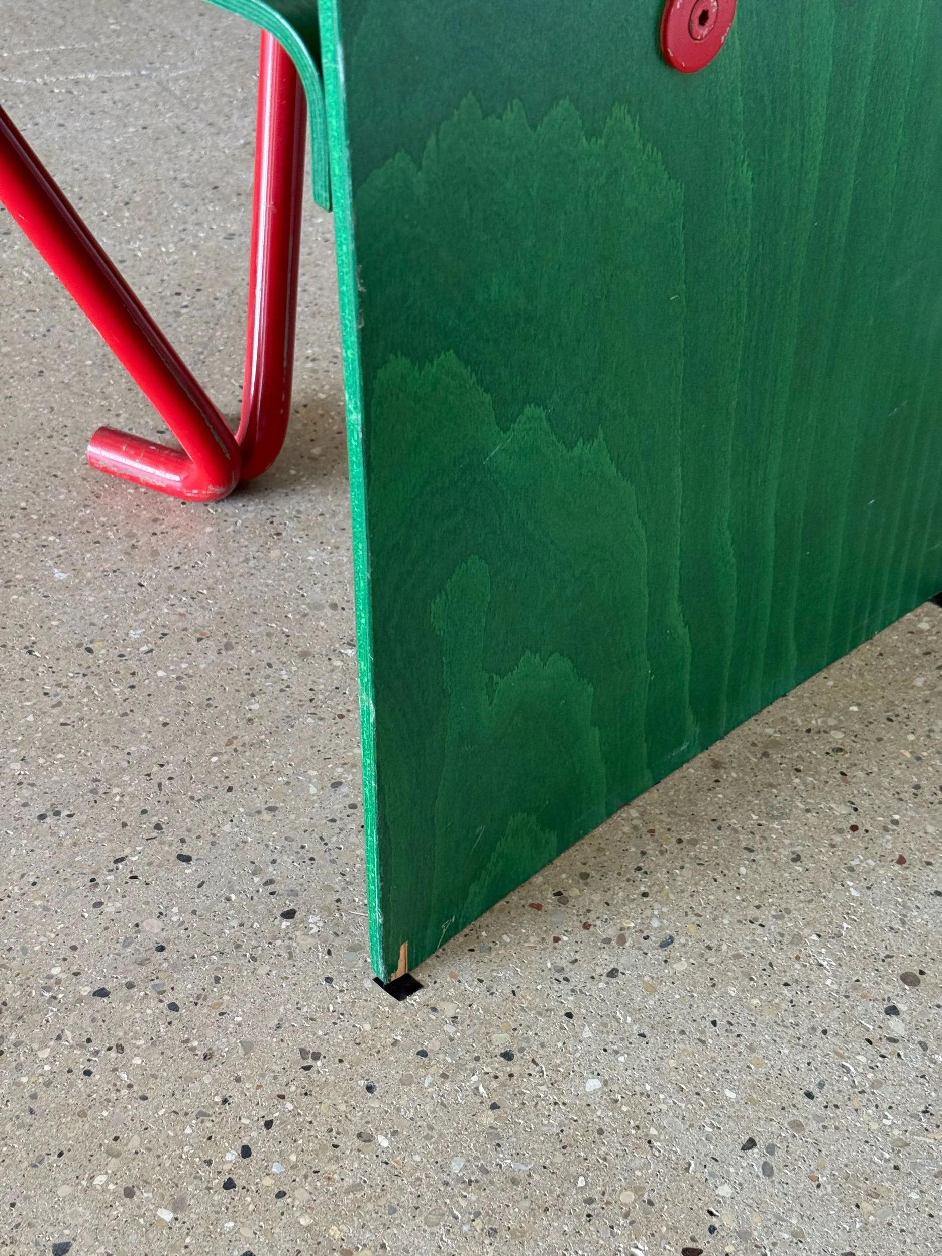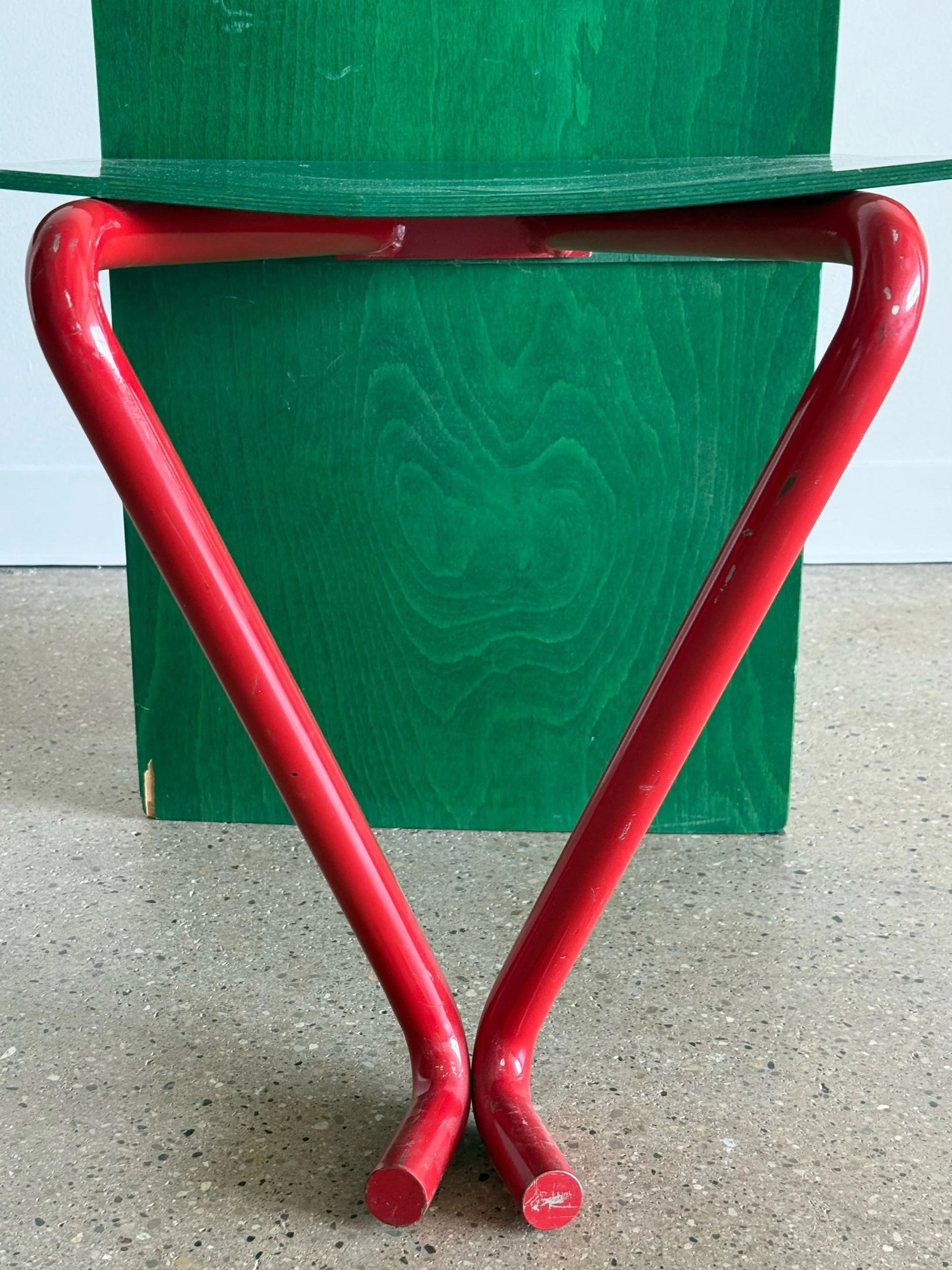 Switzerland, 1986. Green-dyed plywood with red lacquered tubular steel legs. Four of seven leg varieties produced. Priced individually, see last photo for style ID.