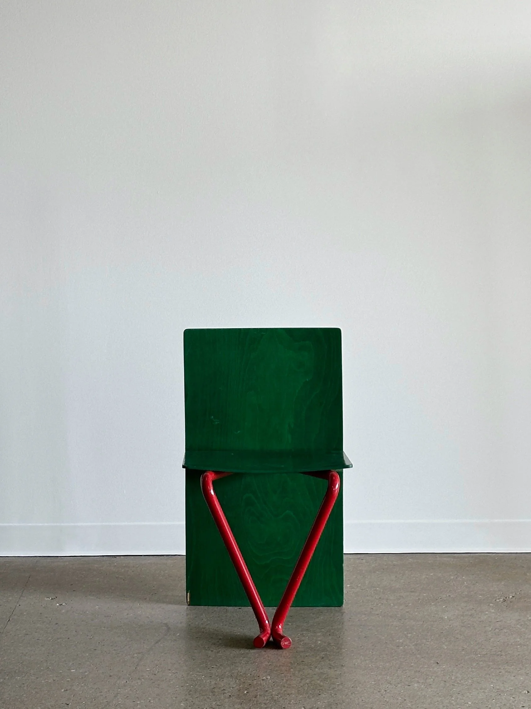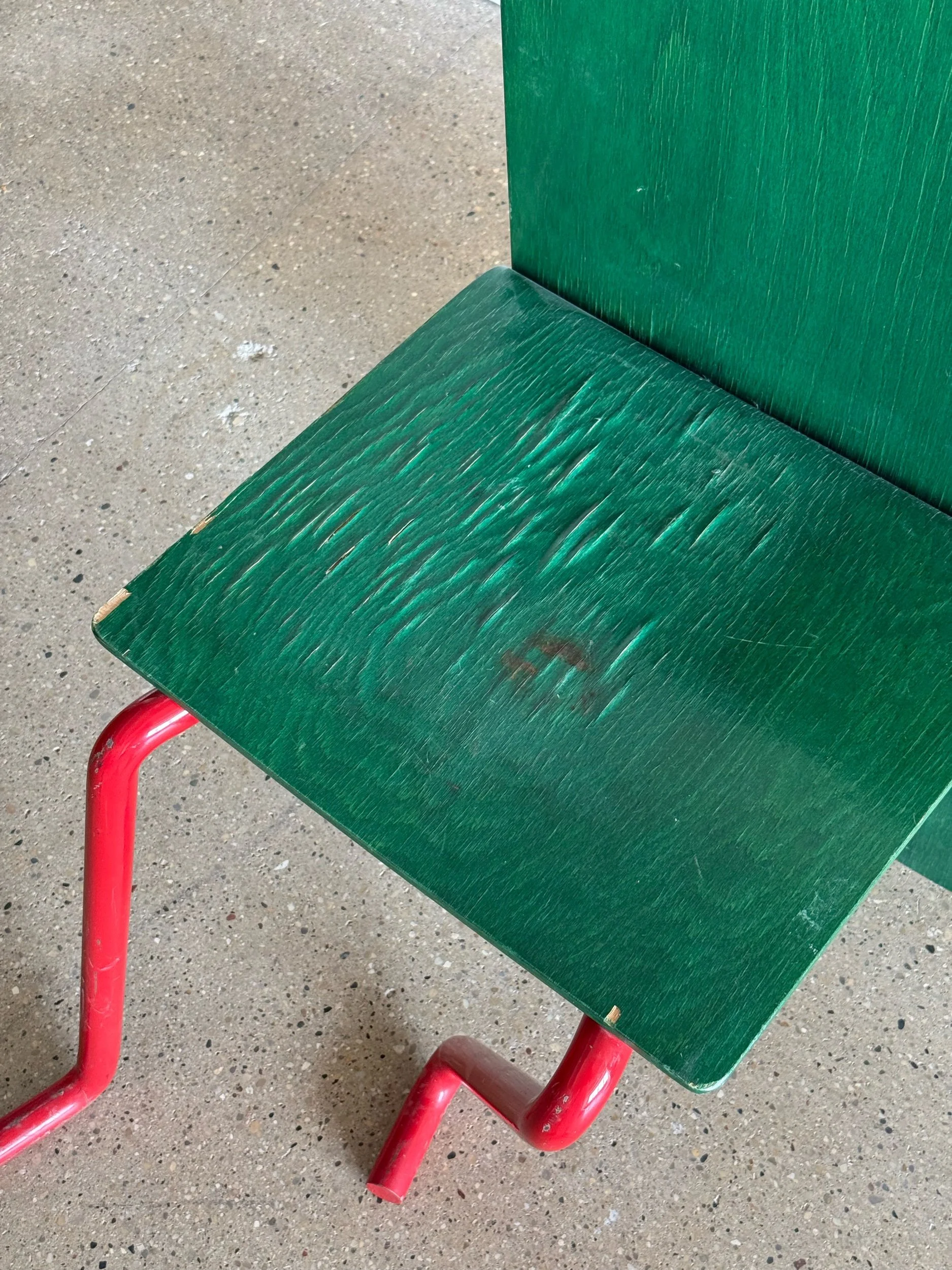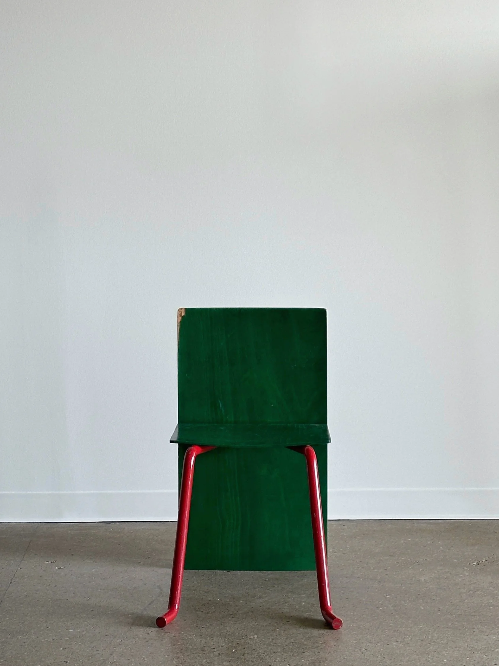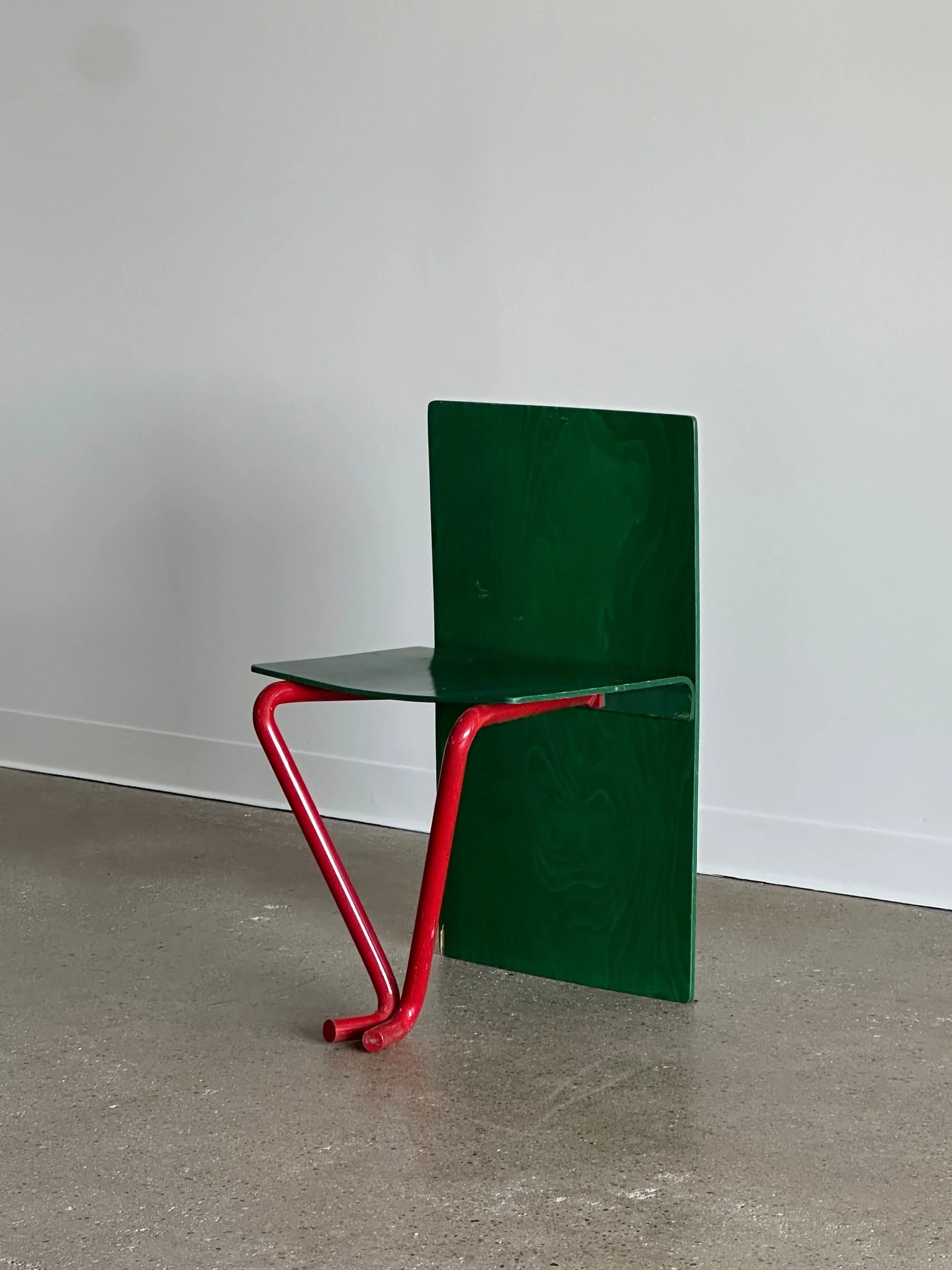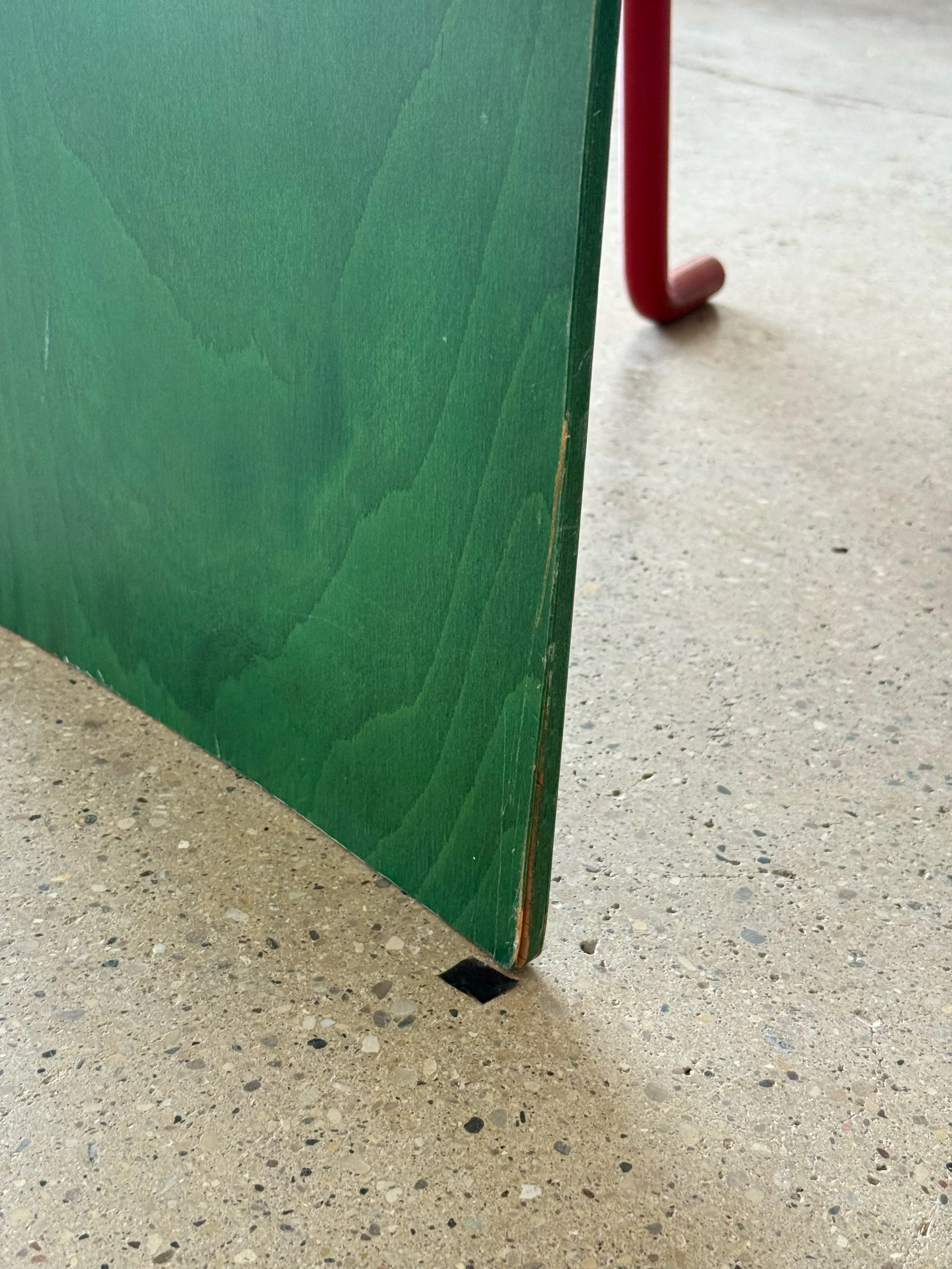Switzerland, 1986. Green-dyed plywood with red lacquered tubular steel legs. Four of seven leg varieties produced. Priced individually, see last photo for style ID.