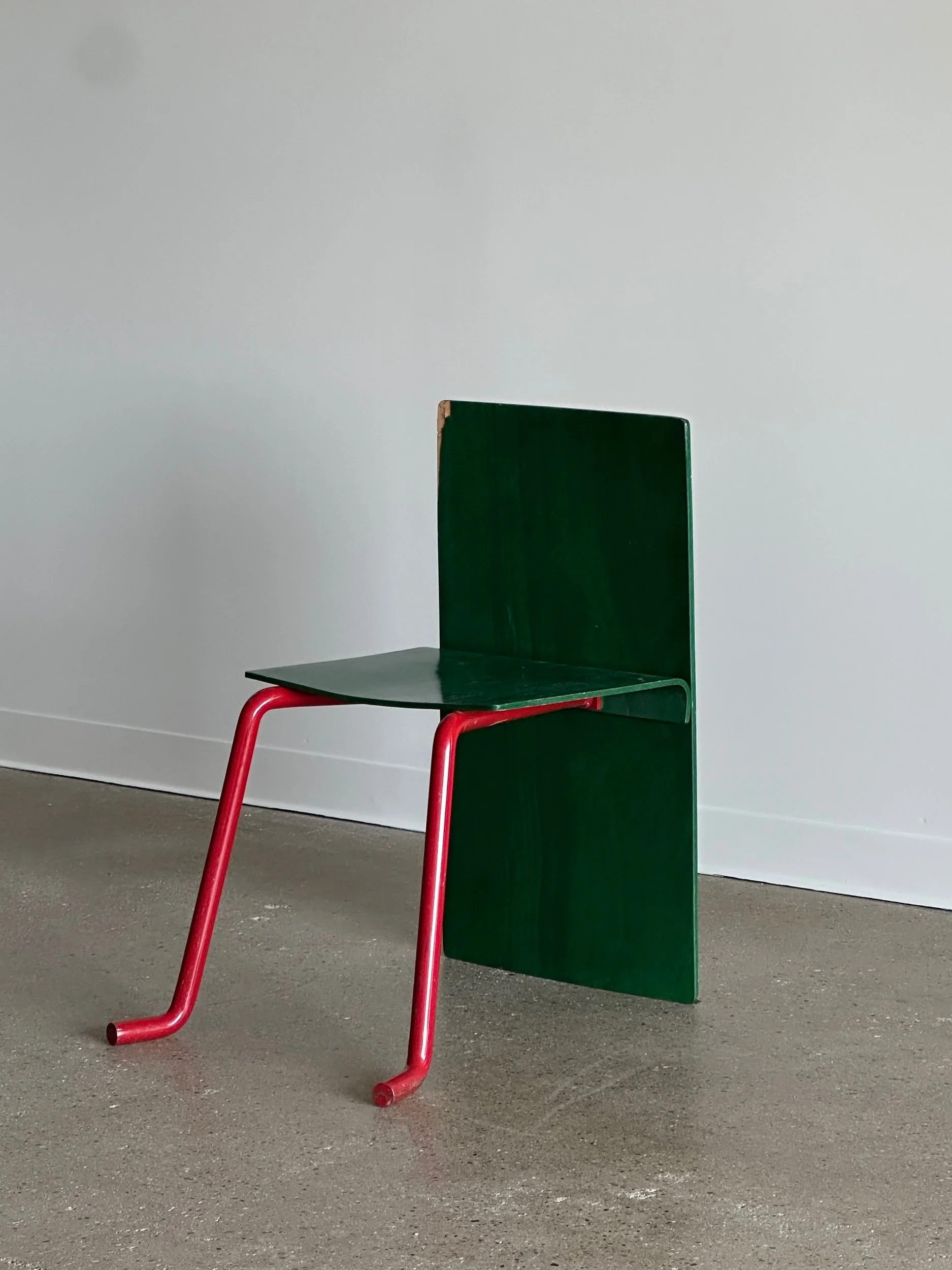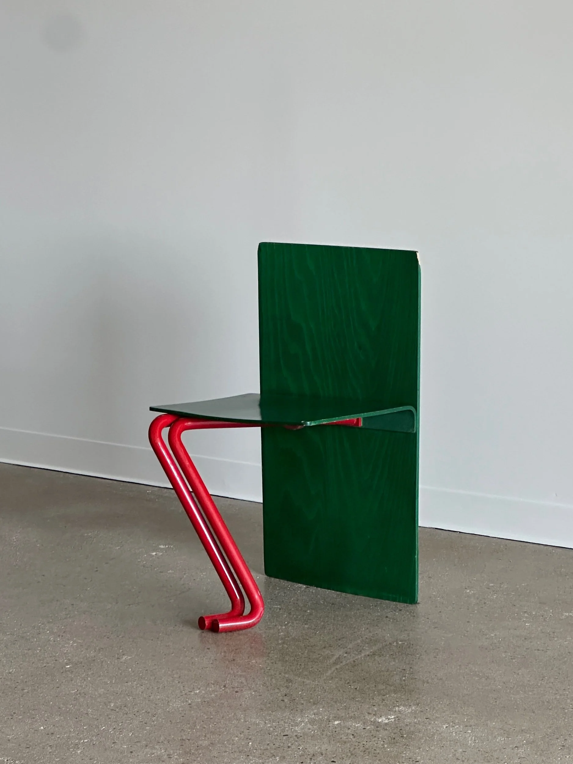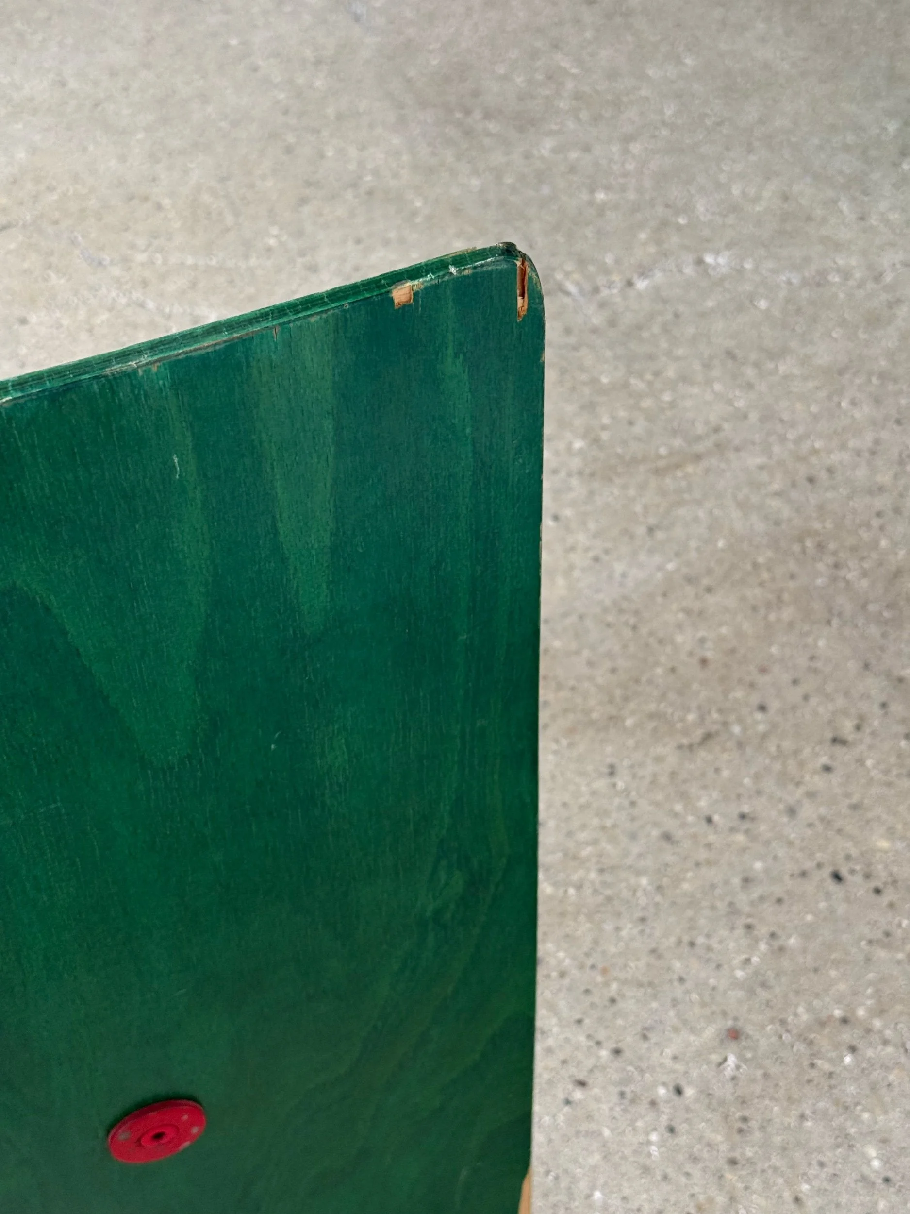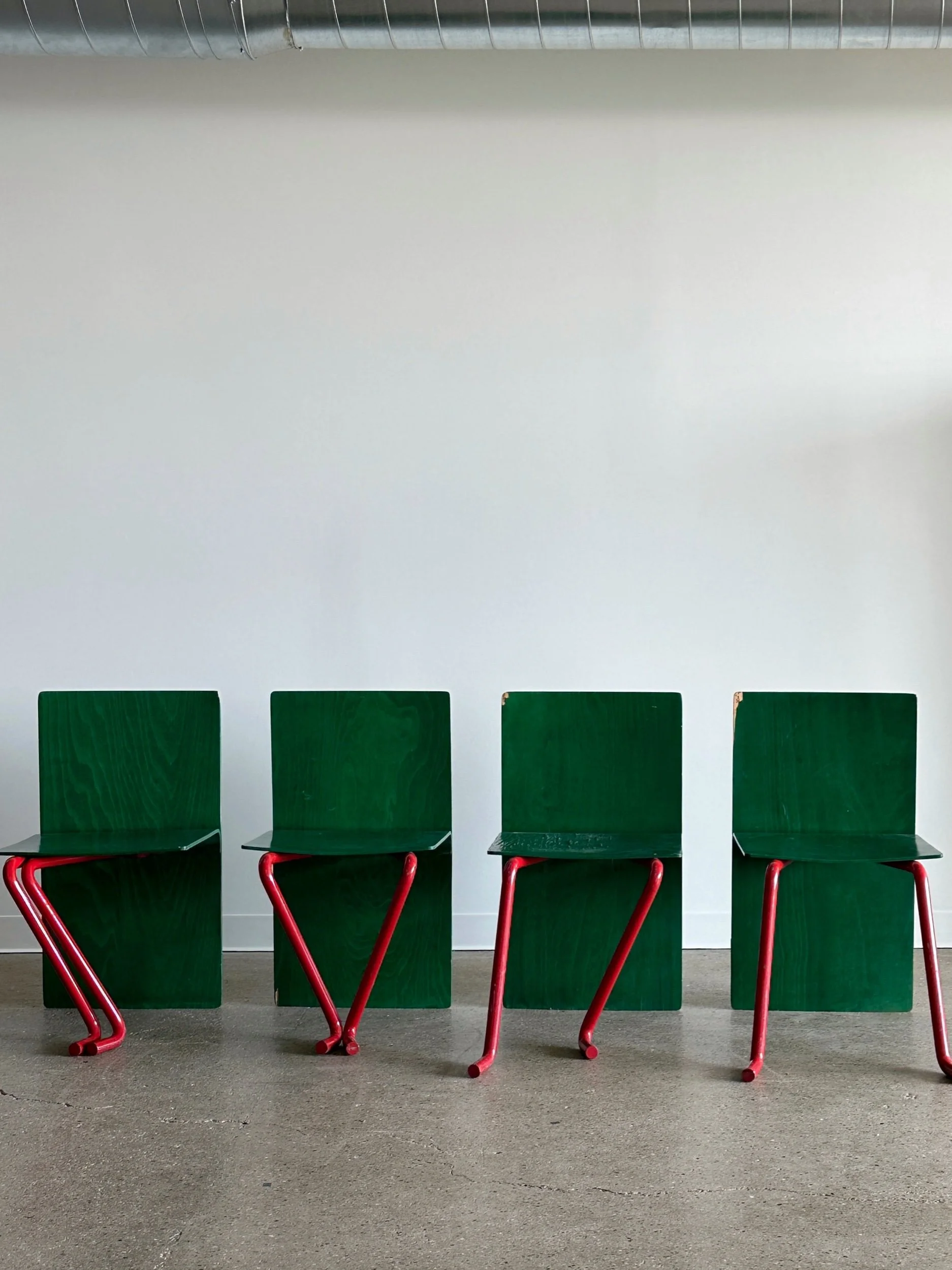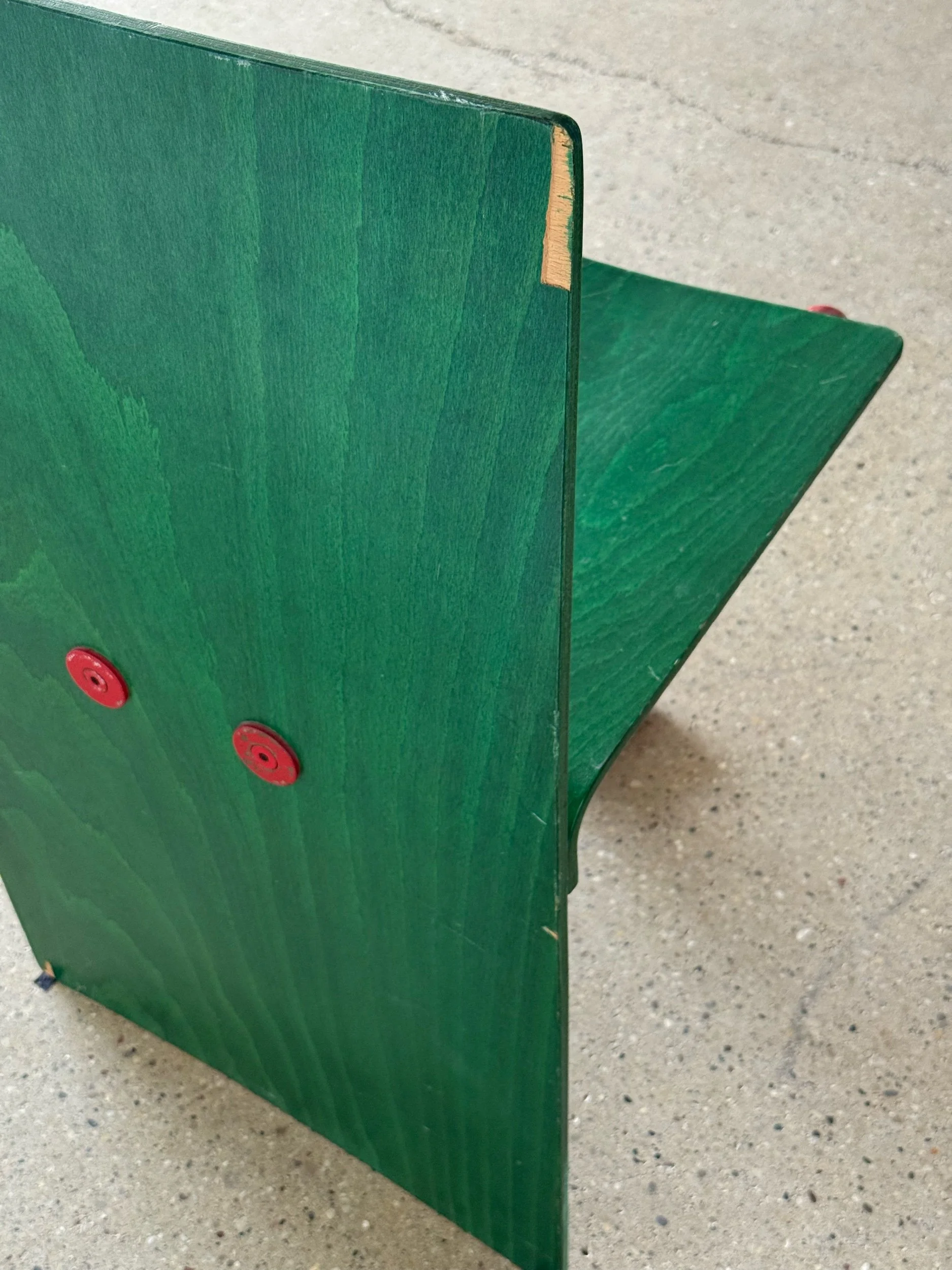 Switzerland, 1986. Green-dyed plywood with red lacquered tubular steel legs. Four of seven leg varieties produced. Priced individually, see last photo for style ID.