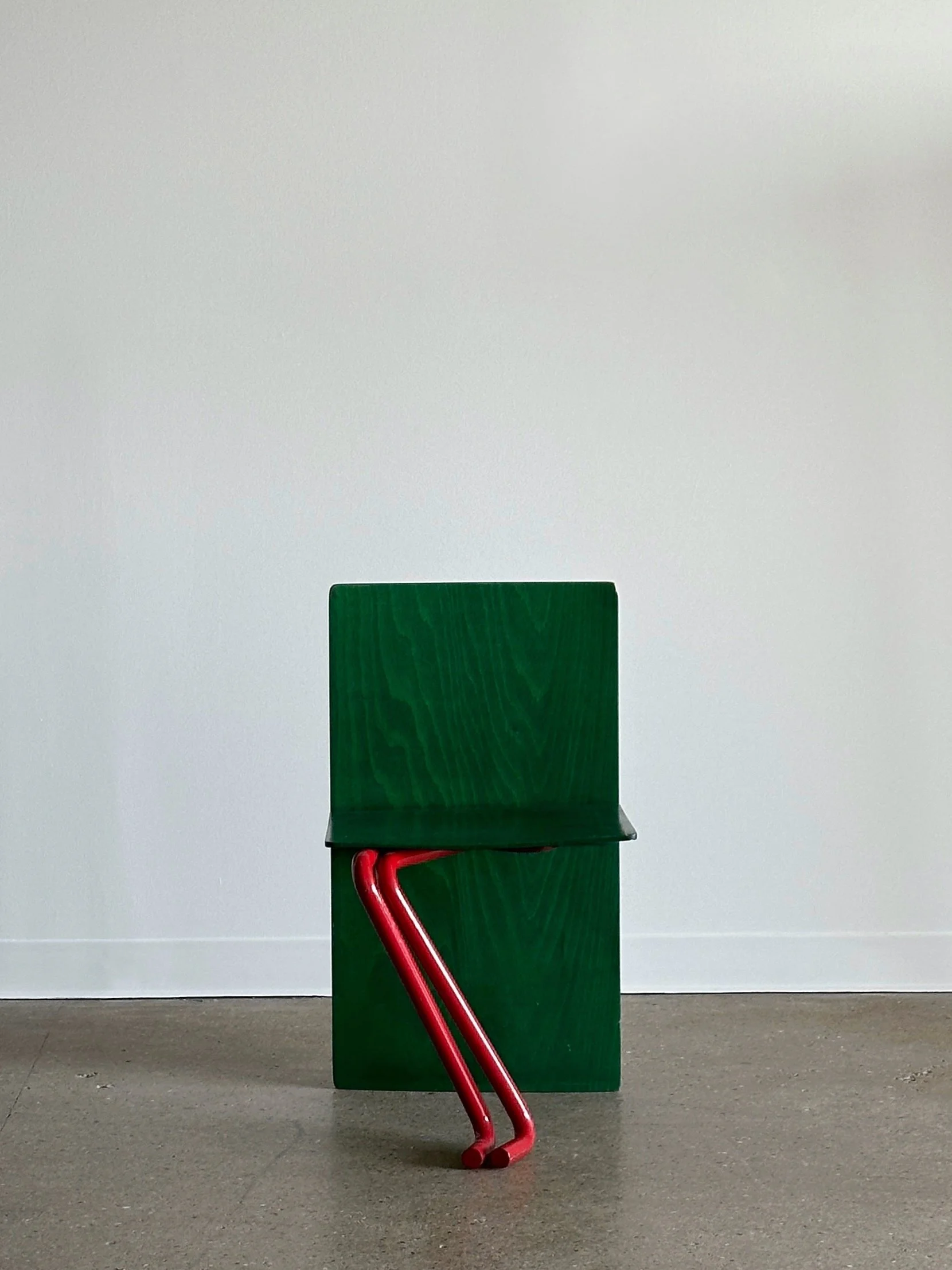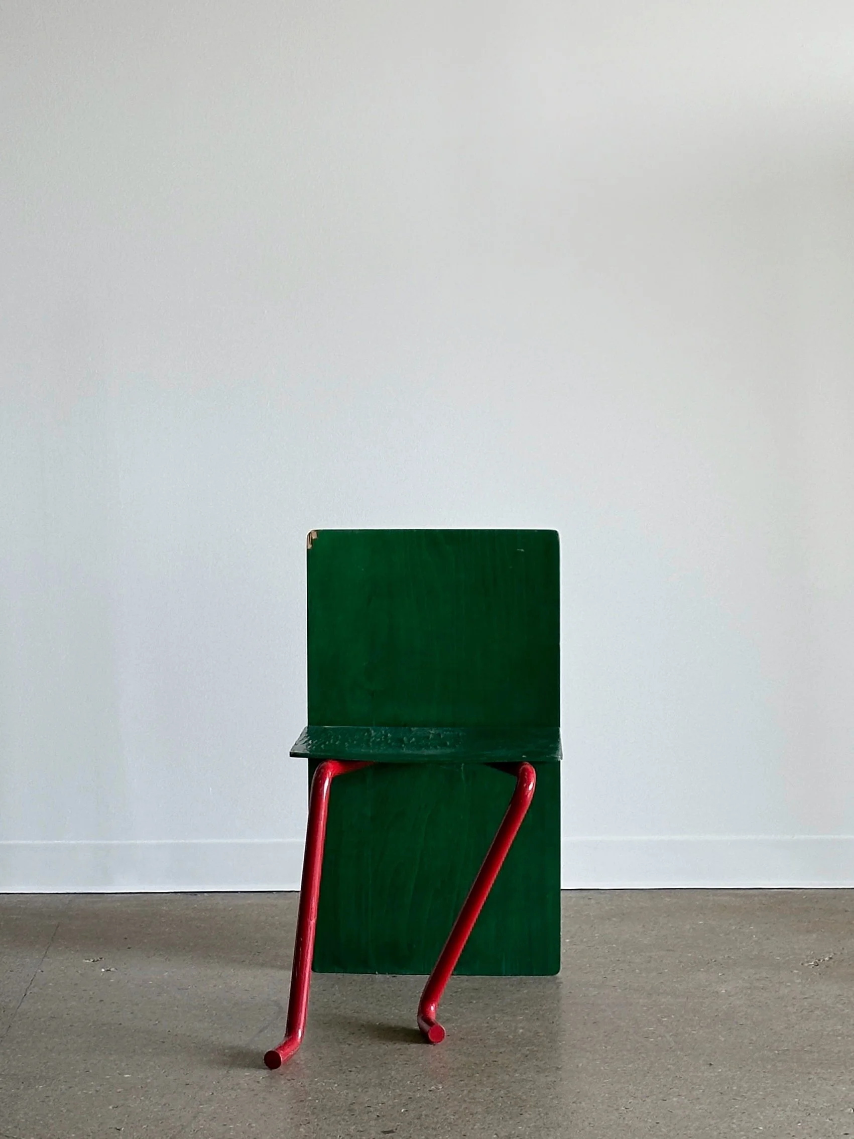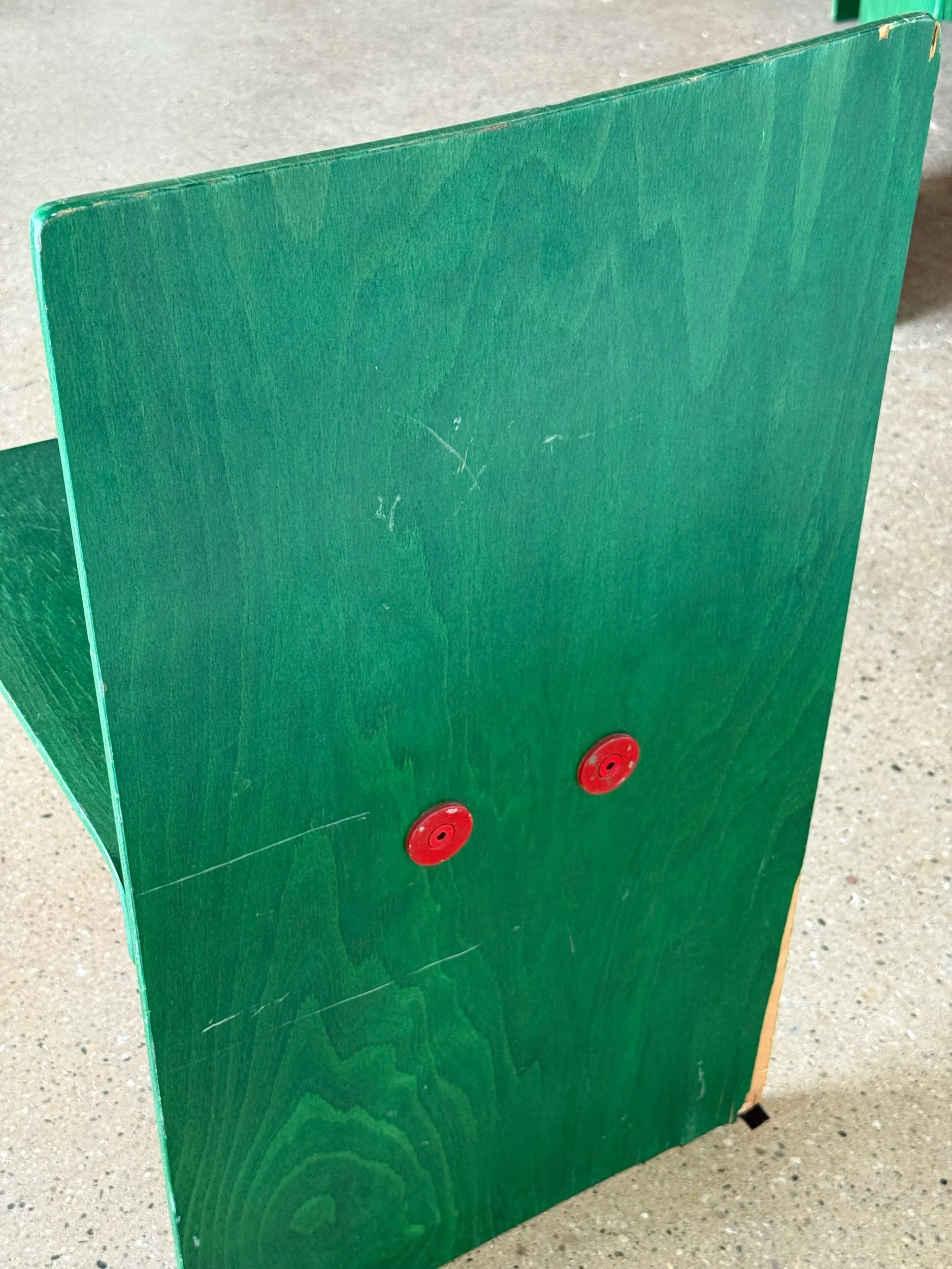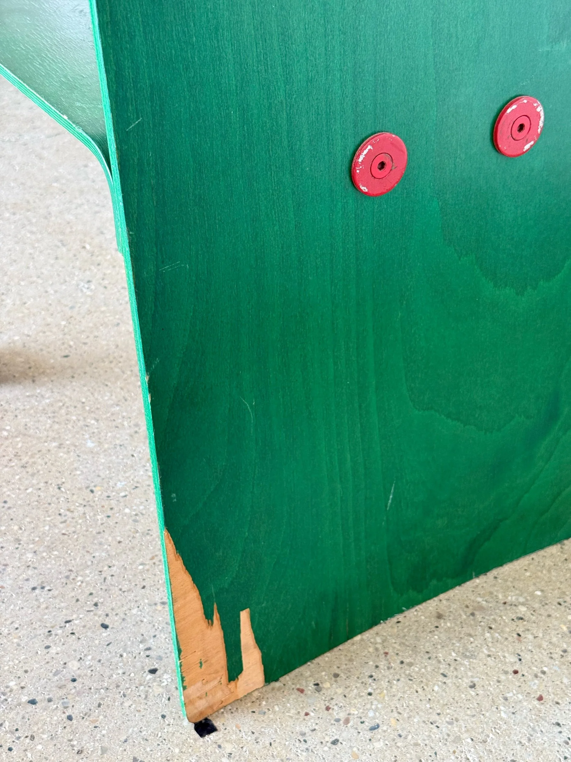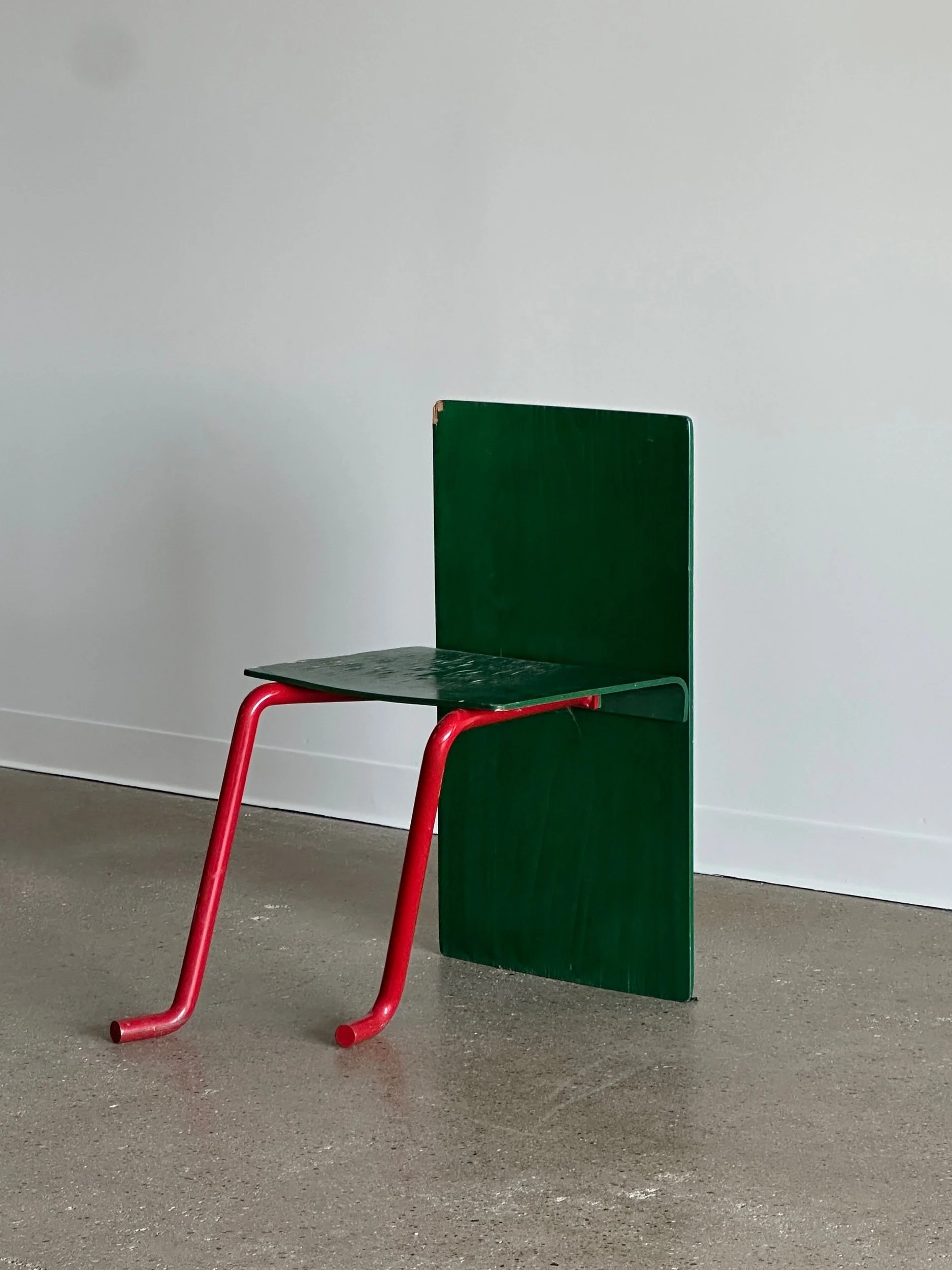 Switzerland, 1986. Green-dyed plywood with red lacquered tubular steel legs. Four of seven leg varieties produced. Priced individually, see last photo for style ID.
