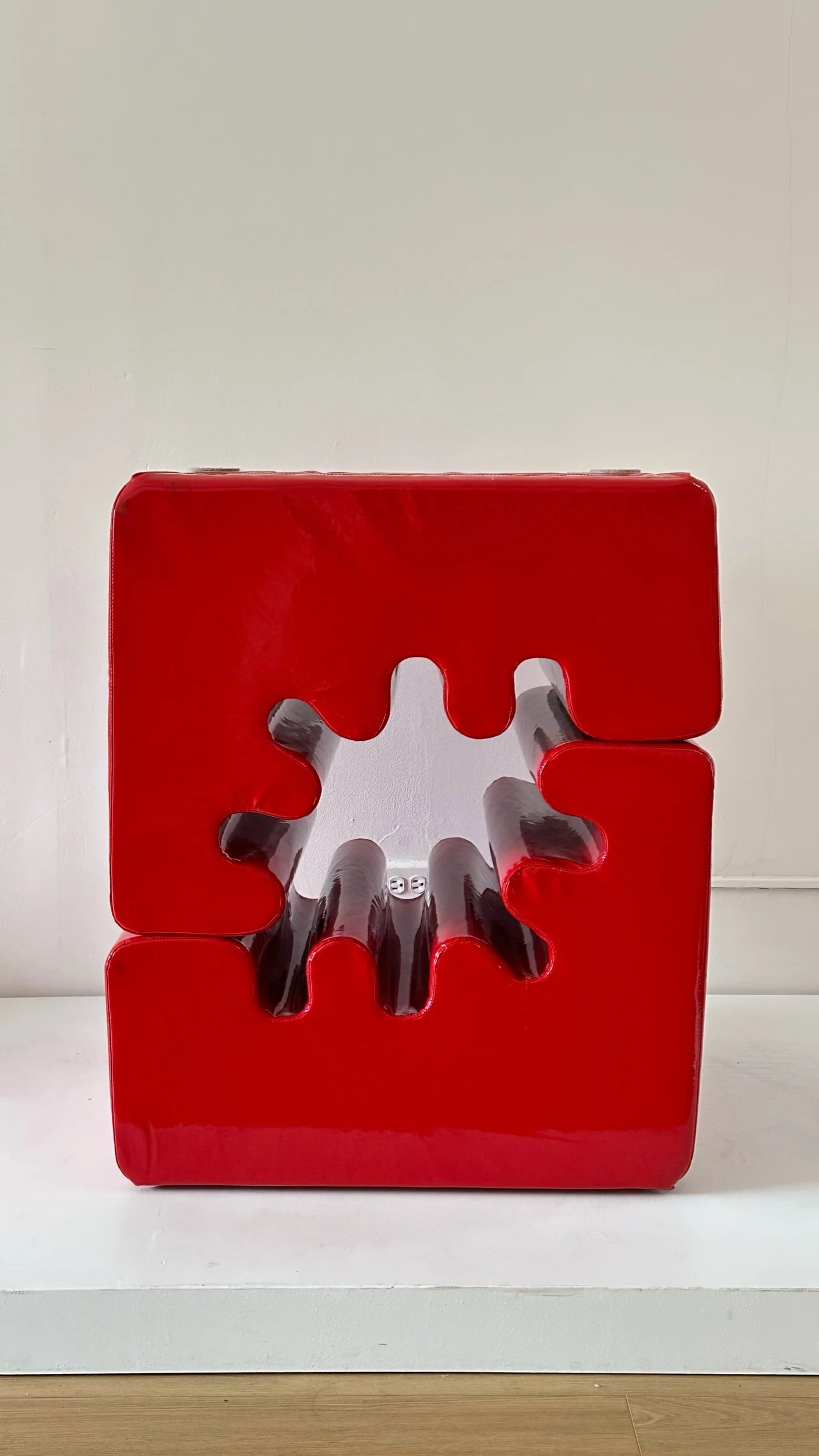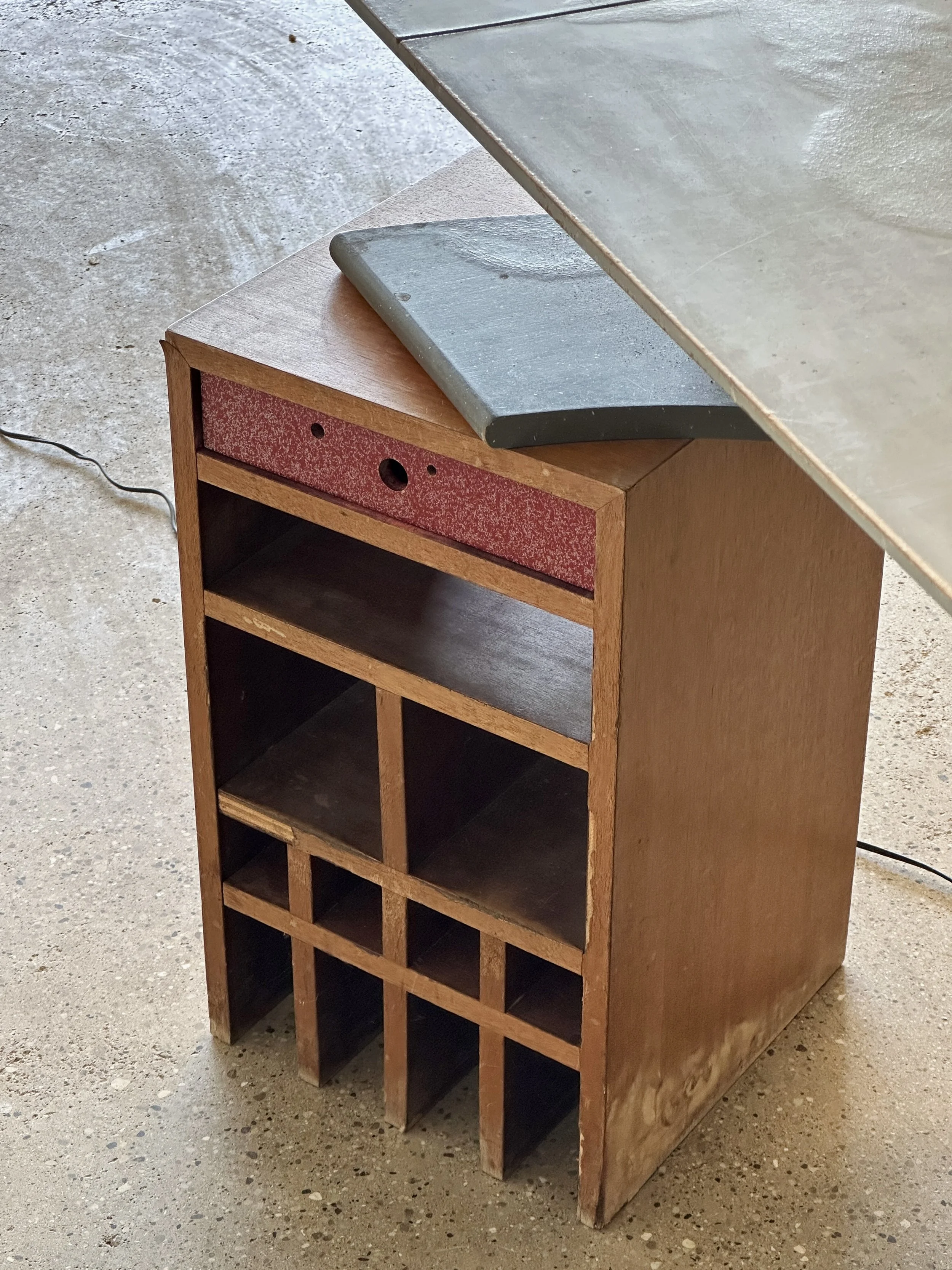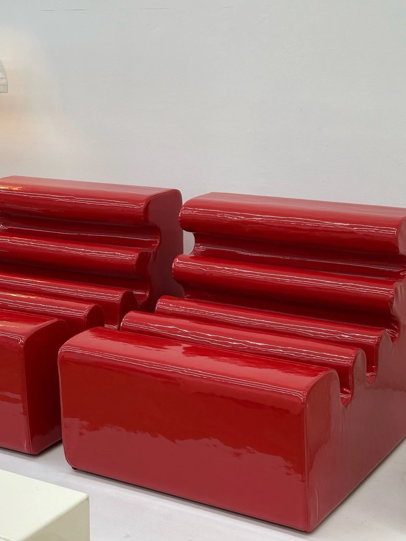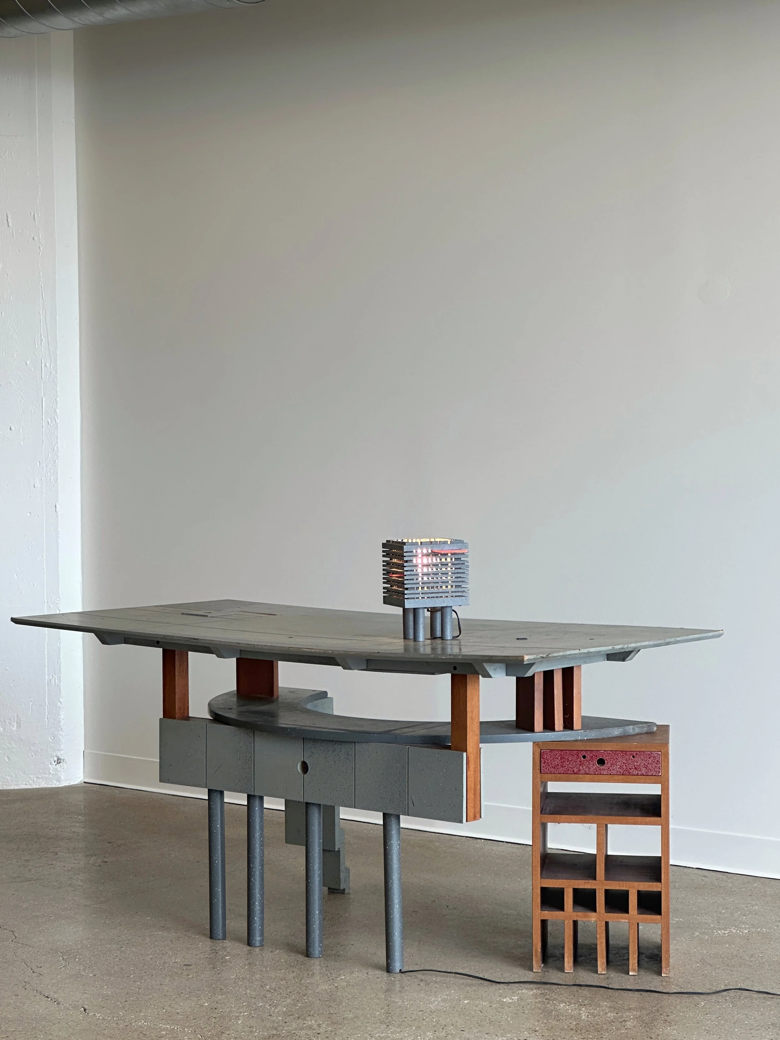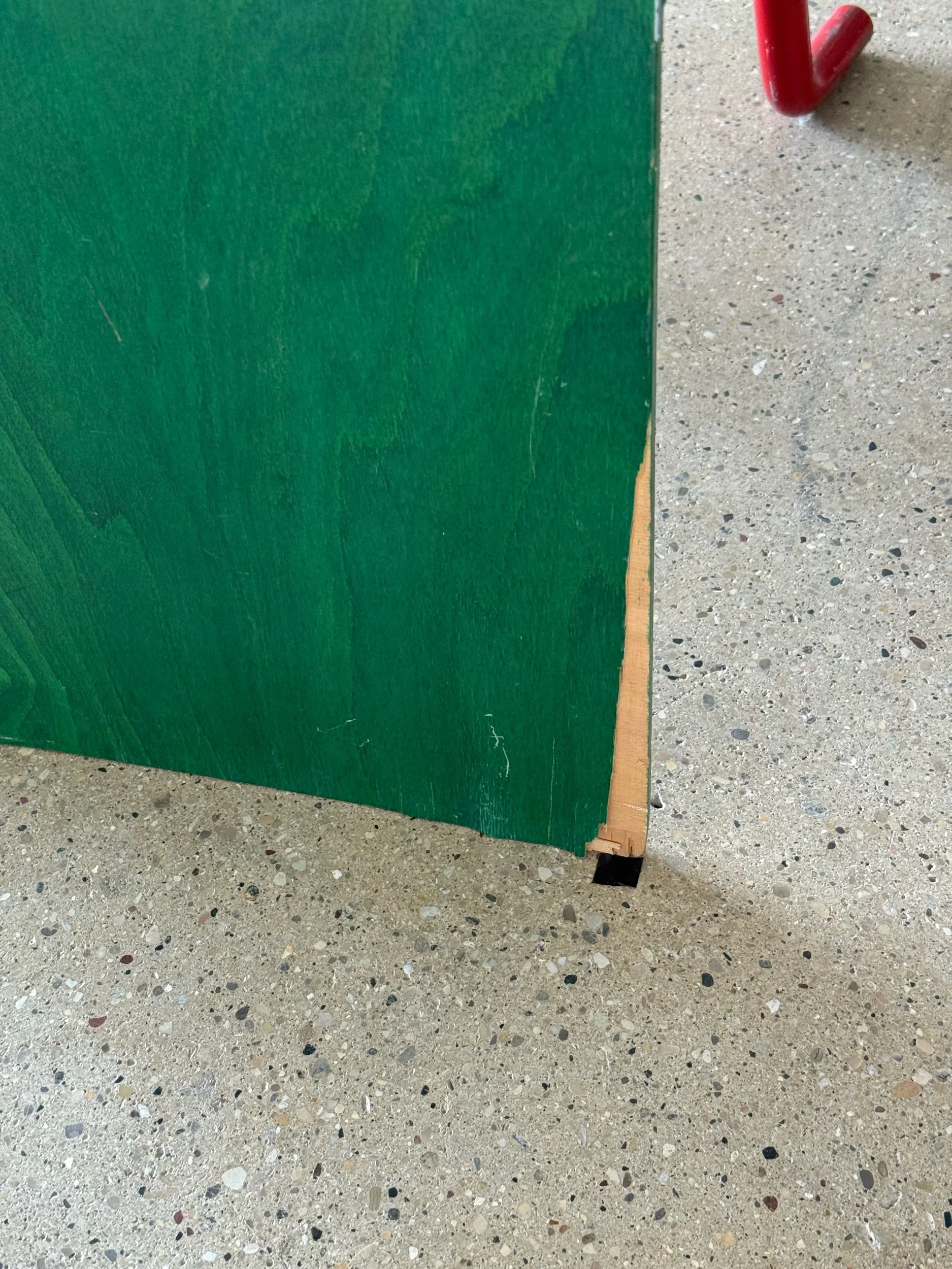 Switzerland, 1986. Green-dyed plywood with red lacquered tubular steel legs. Four of seven leg varieties produced. Priced individually, see last photo for style ID.